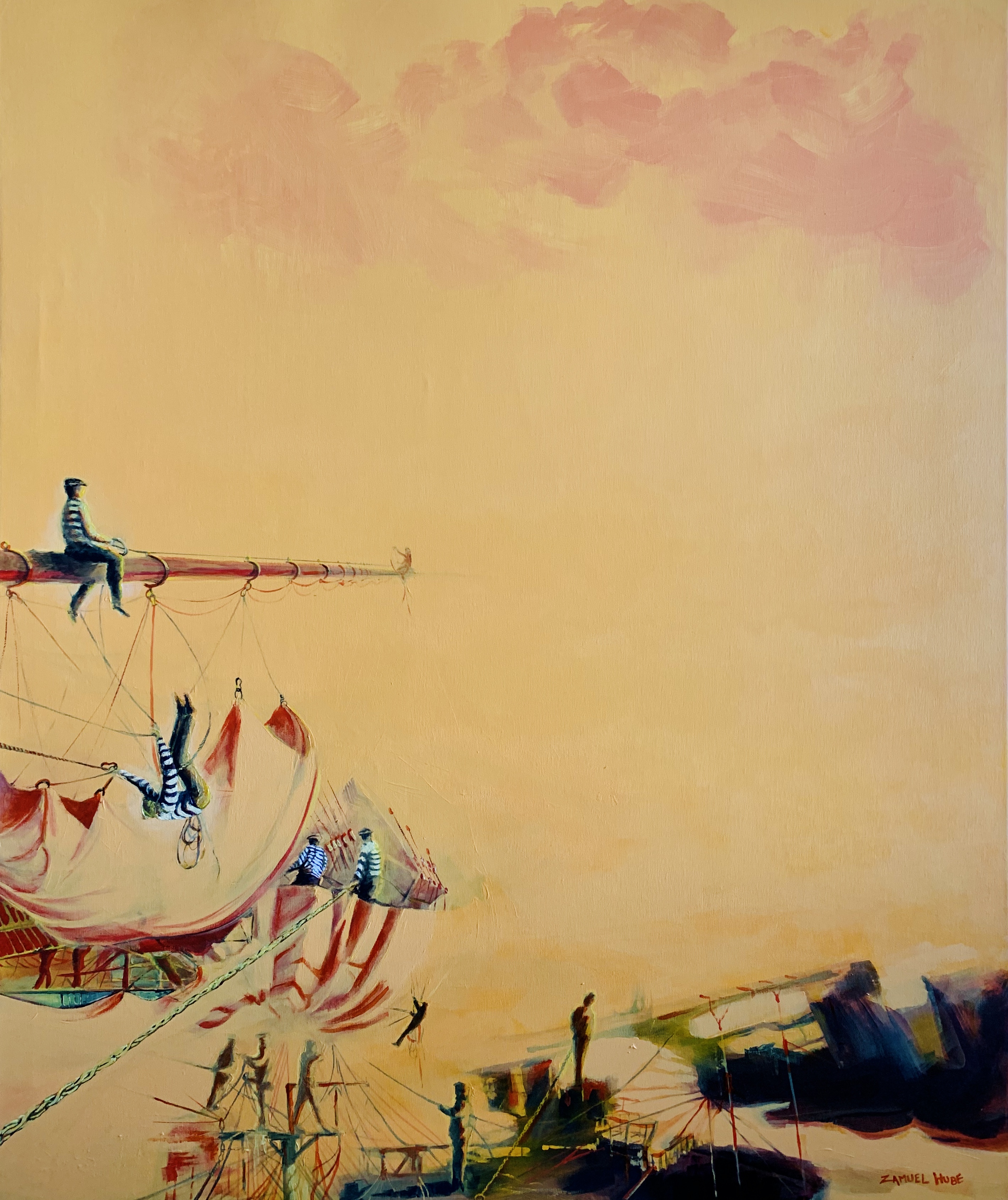 Suomalaisen taidemaalarin Zamuel Huben akryylivärimaalauksessa on esitettynä muistikuvia Tuulitehtaalta. Teoksessa on purjeita ja ihmisiä hoitamassa purjeita. Teos on valmistunut vuonna 2020 ja se on kooltaan 100cm x 120cm.