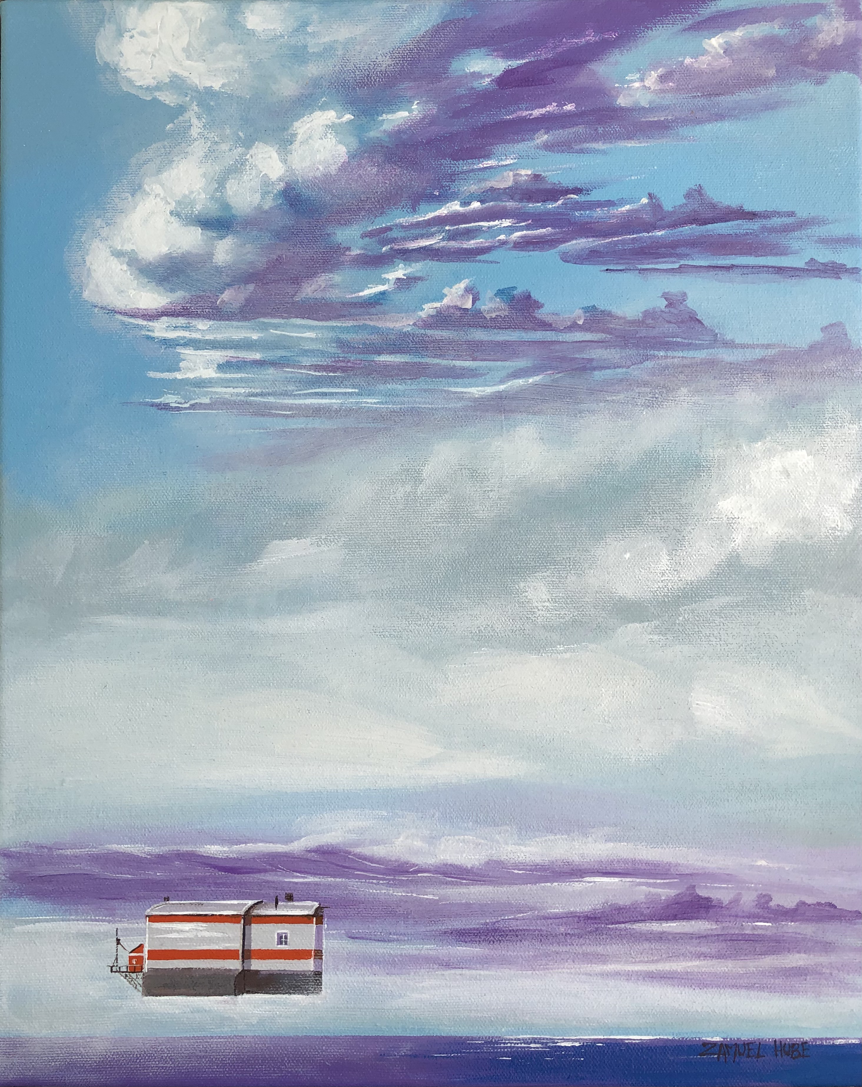Suomalaisen taidemaalarin Zamuel Huben akryylivärimaalauksessa on esitettynä aavameri ja pilvinen taivas sekä meren yläpuolella leijuva rakennus. Teos on valmistunut vuonna 2021 ja se on kooltaan 32cm x 40cm.