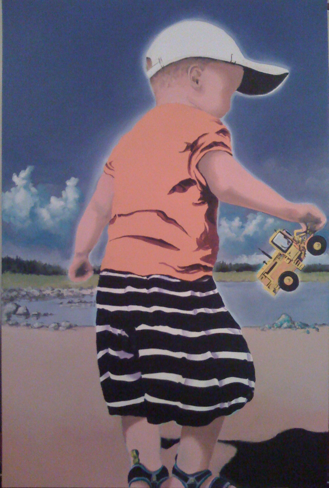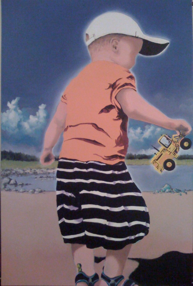 Zamuel Hube “The giant on the beach”, Oil and acryl on canvas 2009, 90 x 60 cm. I painted these two boy figures to exhibition in Portugal in purpose to show something Finnish in bright colours and special summer athmosphere due the fact that we have lovely summers here.